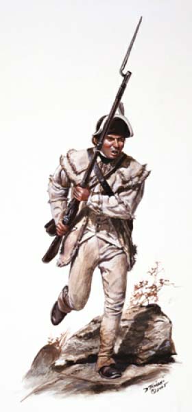 Gramberg’s information on the correct uniform for a 2nd. Va. Light Infantry Regiment was to be white linen breeches and waist coat with white stockings and black gaiters, white shirt with a leather neck stock, belly cartidge box, bayonet scabbard with a leather helmet with a bear skin crest with a linen white band around the helmet with a cockade and plume.